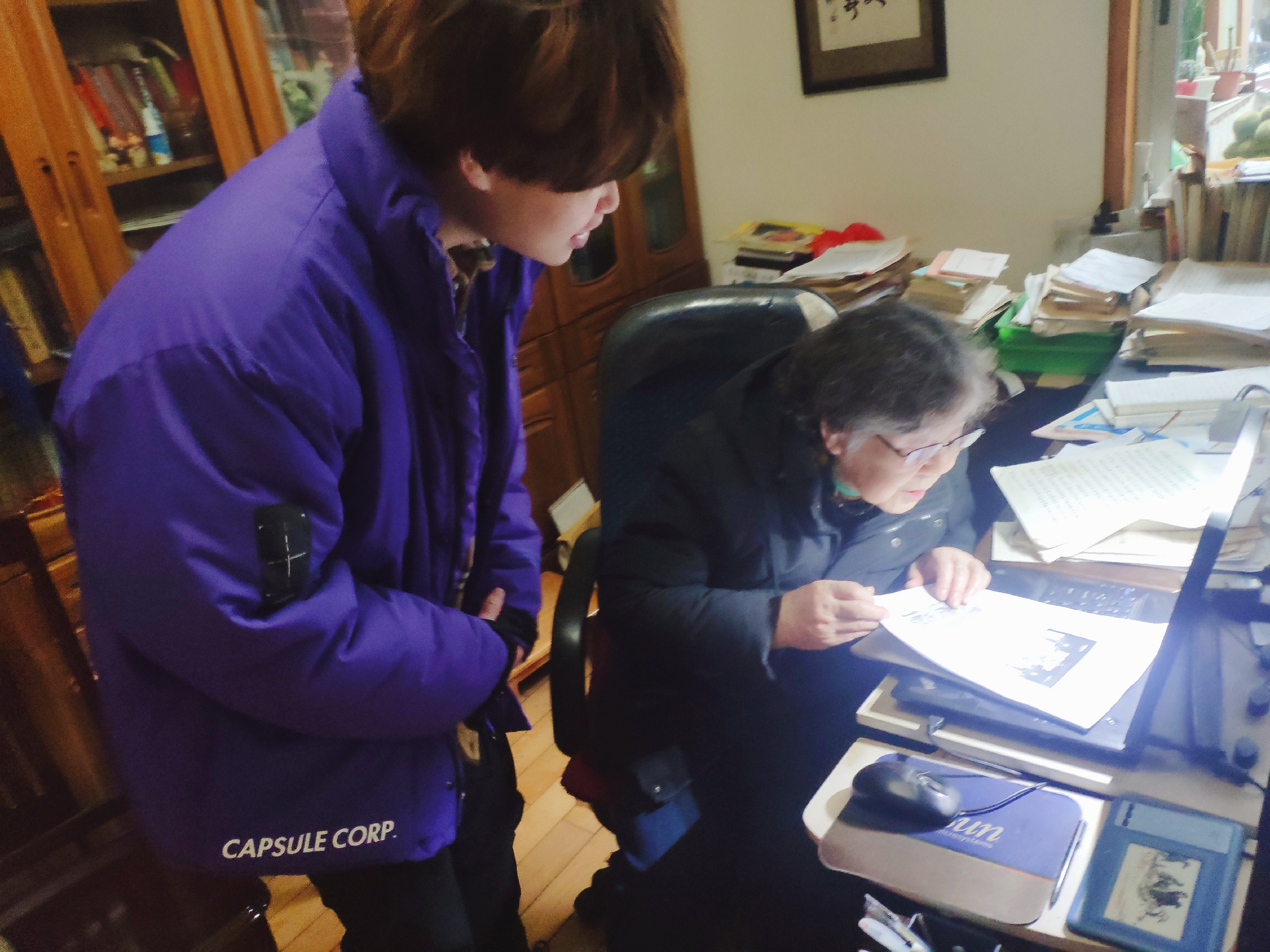 杨宜霖同学为王绿萍教授介绍2019年学校发展的大事