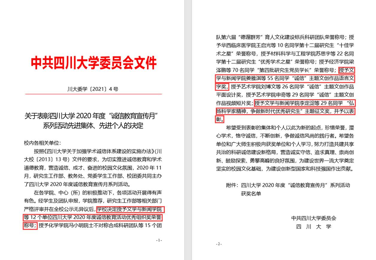 四川大学2020年度“诚信教育宣传月”系列活动由研究生工作部、教务处、党委学生工作部、校团委共同主办,旨在推进诚信教育和学术道德教育,营造诚信、成才、奋进的校园文化氛围。在1月14日发布的《关于表彰四川大学2020年度“诚信教育宣传月”系列活动先进集体、先进个人的决定》中,体球网手机比分