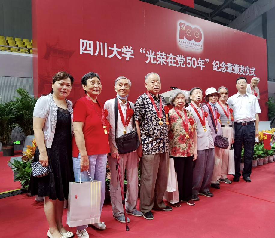 四川大学校党委常委、副校长李蓉军教授为老党员戴上纪念章