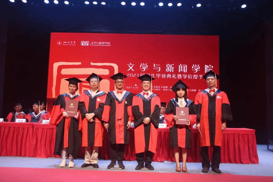 曹顺庆教授、古立峰书记、李怡院长在主会场为2018级中国现当代文学硕士生张益智、2018级新闻与传播学硕士生宋信祺、2018级艺术学理论硕士生漆依依、2017级汉语言文学本科生刘玏、2017级汉语言文学本科生刘霁月、2017级网络与新媒体本科生刘雨凡、2017级广告学本科生钱青云共七名2021届校友联络人颁发聘书后,学位授予仪式正式开始。伴随着乐声,主会场四川大学杰出教授曹顺庆、古立峰书记、李怡院长和分会场周维东副院长、操慧副院长等出席典礼的老师分别为体球网手机比分