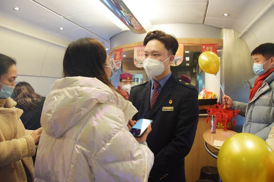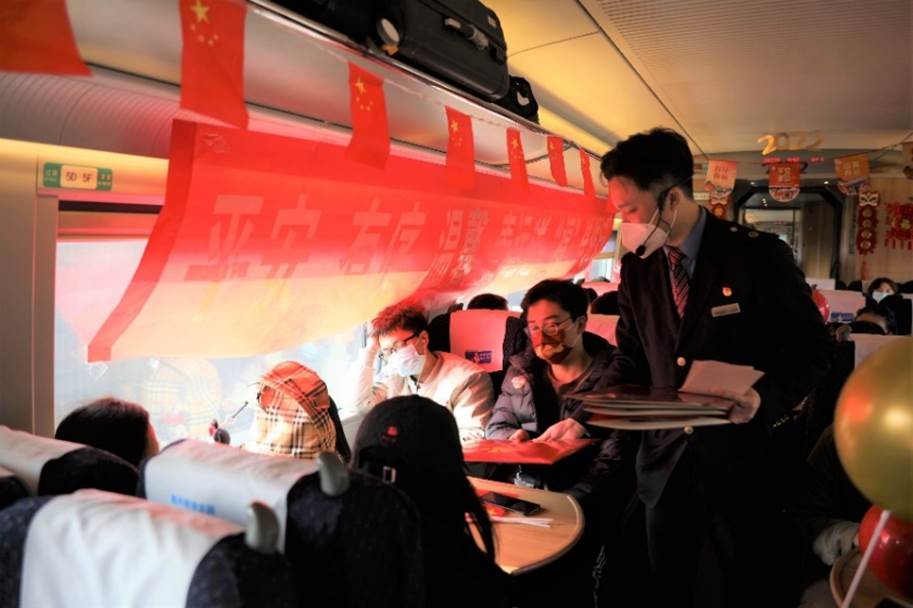 春节临近,乘务组特地设置了新春活动,通过趣味问答和精心制作的贺卡、纪念品,科普出行知识、了解旅客诉求的同时,也为大家送上特别的节日祝福。活动结束后,列车员朱荣鹏小心翼翼地收起大家写好的明信片,看着上面一份份真挚的感想和愿望,他决定明年将这些明信片重新寄给旅客,“我希望大家能记住这次春运,明年也能回想起这段特别的旅程。”