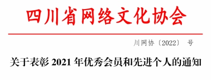 获得“四川省网络文化协会2020年度优秀会员称号”后,第二次荣获年度十佳杰出会员荣誉称号。