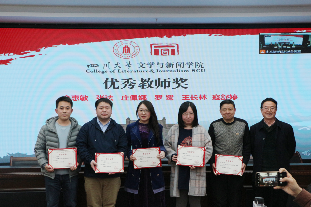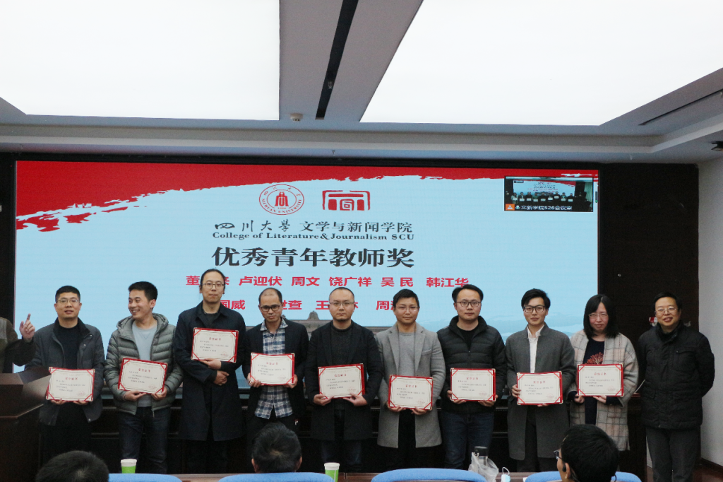的新教师:王兆鹏教授、肖伟胜教授、宋曜研究员、贺碧霄副教授、陶熠老师。这些新进老师先后发言,表达了加入川大文新学院的喜悦之情。