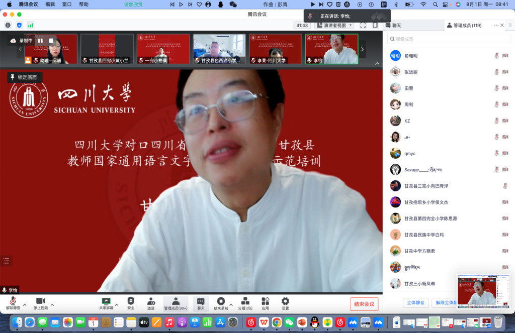 雷汉卿教授指出,强国必须强语,强语助力强国。“党的十八大以来,党中央国务院高度重视语言文字推广工作,语言文字事业站位更高远,内涵更丰富,取得了历史性成就。我国是多民族多语言的国家,语言状况复杂。推动经济文化事业发展,促进各民族交流都需要重视推广通用语言文字。扶贫先扶智,扶智先通语。”他强调了推广通用语言文字在“脱贫攻坚”行动中的重要性,并结合实际案例说明提升国家通用语言文字能力已经成为脱贫致富的必备条件之一。最后,雷汉卿教授寄语各位学员:“四川大学国家语言文字推广基地高度重视本次培训,优化师资团队,精心策划培训课程,希望大家认真上课,学有所获!”