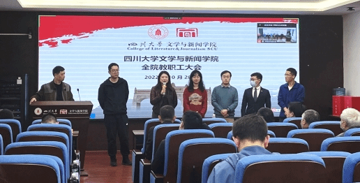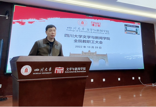 党委书记古立峰教授通报了学院近期重点工作。古立峰书记首先介绍了本学期新进的六位老师,分别是专职博士后郭旭东老师、侯建科老师、车祎老师、兰兴老师,辅导员郑格老师和党政办高小珺老师。接着传达了四川大学第九次党代会召开和会议精神。随后,他通报了学院近期获得的一些成绩和表彰,如学院入选全国五所出版共建单位,目前正着力建设出版学院;设立在学院的语委基地积极开展普通话推广及调研活动,参与乡村文化振兴相关工作;四川大学杰出教授、体球网手机比分