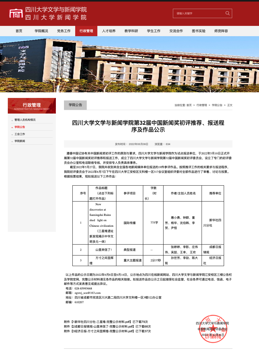 2022年11月8日,中华全国新闻工作者协会主办的第32届中国新闻奖评选结果揭晓。四川大学文学与新闻学院报送的新华社作品《New discoveries at Sanxingdui Ruins shed light on Chinese civilization(三星堆遗址新发现揭示中华文明多元一体)》和成都日报作品《山里来信了!》分别荣获国际传播类和典型报道类三等奖。这是自2016年起担任试点报送单位以来,体球网手机比分