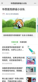 四川大学华西医院科普专栏“华西医院辟谣小分队”自2015年创立至今,依托优质医学专家智库,在华西医院各大新媒体平台打造专栏,面向大众开展健康科普工作。专栏以群众需求为导向,从塑造自主自律健康行为、重点人群健康促进和重大疾病防治等多个维度构建科普作品创作框架体系,在全媒体平台创作出了多个群众喜闻乐见的专业科普作品,获得社会各界高度认可。