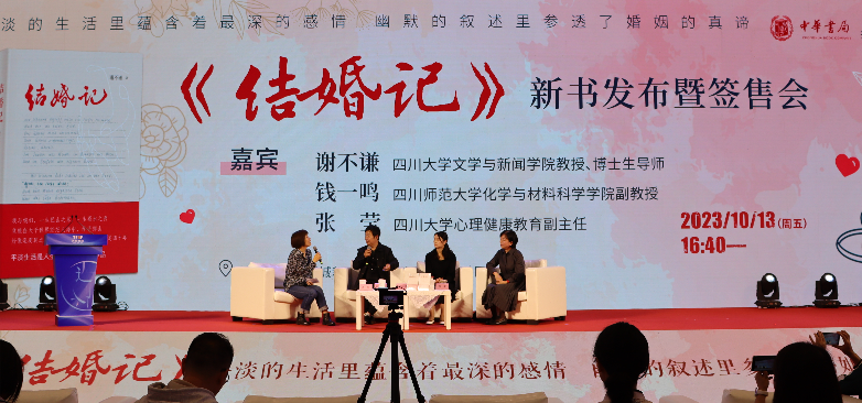 退休教授谢谦老师创作的散文集《结婚记》新书发布会暨签售会、新书分享会分别于成都世纪城新会展中心和文轩BOOKS成华店成功举办。与会嘉宾有谢谦夫妇、四川大学心理健康教育中心副主任张莹、原成都商报副主编郑晔与该书责任编辑马燕等。