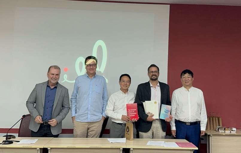 与坎皮纳斯州立大学签署了重要的学术合作协议。坎皮纳斯州立大学国际事务执行主任Osvaldir Pereira Taranto教授、语言研究所所长Petrilson Pinheiro教授、Márcio Seligmann-Silva教授及国际合作处代表Mayara Morais女士出席了签约仪式。此次协议的签署标志着双方在比较文学领域的合作进入了一个新的阶段。双方在洽谈中进一步明确了以下四项合作内容:1.举办“中国-巴西文明互鉴与比较文学双边年会”;2.高端学术讲座与教授互访;3.英文期刊合作交流;4.师生互派与交流项目。