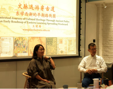 王晓路教授担任主讲嘉宾,四川大学外国语学院特聘副研究员蒋岩老师担任与谈嘉宾。两位老师与现场100多位听众集聚一堂,从宏观视角到微观案例,共同探讨了东学西渐的早期轨迹及其当代意义。