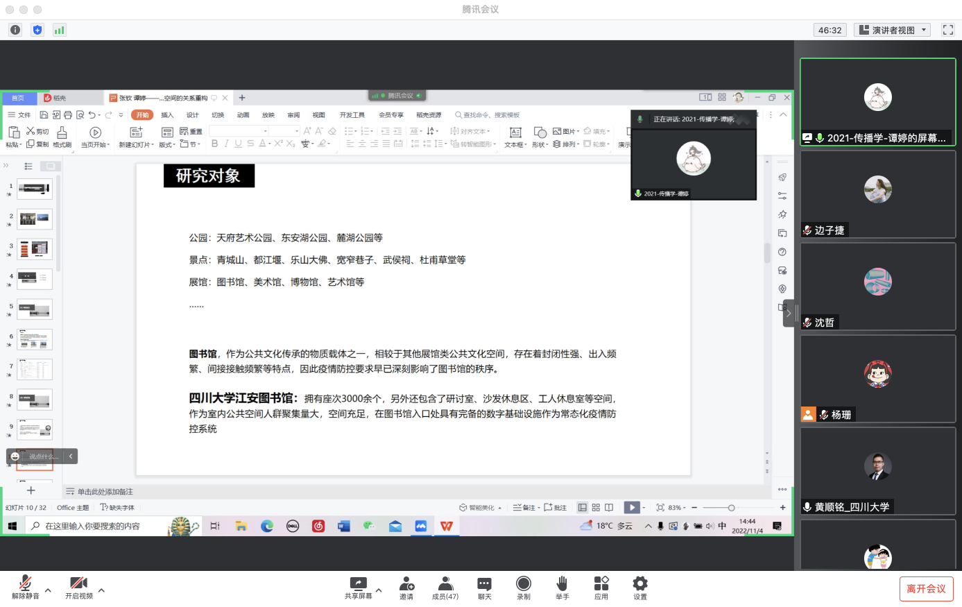 首先是论文展示环节。黄老师介绍到,每组选题都是独特而有趣的。12组报告涵盖了“人与媒介的关系”“现代城市与媒介的关系”“数码城市传播实践”等多个学术议题。作为系列报告的第一组,陈昭博同学和朱晨同学的《“养植物”:物种间性视角下人与居家植物的共生实践》让与会者眼前一亮,他们深入浅出地展现了一个想法从提出到落地的全过程。值得一提的是,此文章经过专家评审,已被“从人类世到城市世:媒介的力量——传播与中国·复旦论坛(2022)”接受。这也是陈昭博同学连续第二年参与此论坛,他去年报告了一篇以数字地图为主题的论文。白昊石同学和刘祖瑞同学分享的《让我们养个火吧:会话中的游戏与电子亲密关系》一文,让与会者纷纷在会议互动区留言感叹学术的趣味和魅力,反响热烈。三场报告会正是以这种线上论文分享的形式,给予疫情常态化防控阶段在校新生以学术的启发和鼓励。