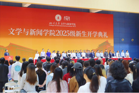 典礼在庄严神圣的国歌声中拉开序幕。院长罗鹭教授首先代表学院向2025级全体新生表示热烈欢迎。他从川大文新人的百年精神烙印谈起,回顾学院办学历程中承载的厚重历史和现实关怀,鼓励同学们既要追求诗意与远方,也要承担责任与担当。他在讲话中勉励同学们立志要早,继承先辈的报国之志;立身要正,肩负强烈的社会责任感和使命感;立学要勤,在笔耕不辍中收获丰收的喜悦;立言要谨,让不朽的言论与学说流传后世,做顶天立地的文新人。