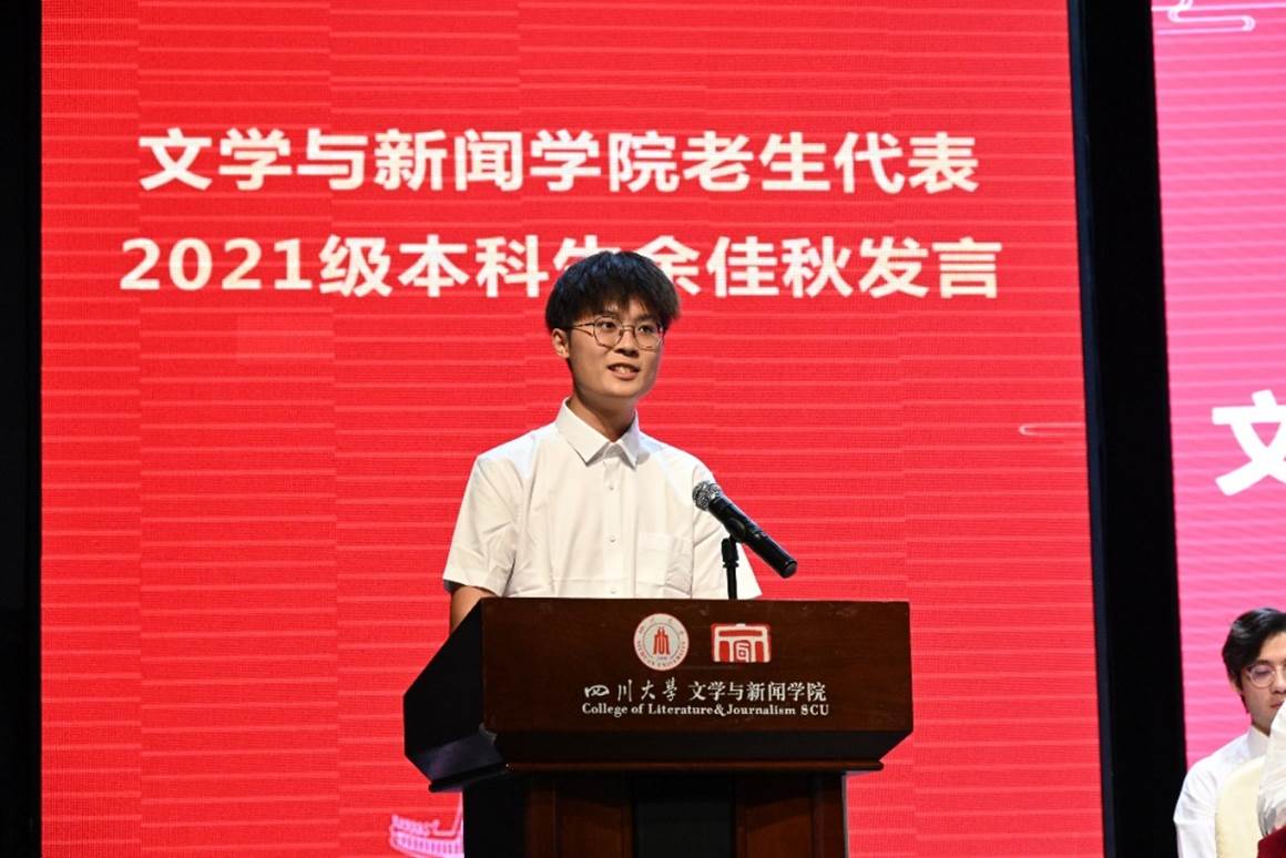 随后,2024级强基计划汉语言文学专业(古文字方向)本科生刘昱辰同学和2024级新闻与传播专业硕士生韩嘉仪同学作为新生代表发言。刘昱辰同学表示,学在文新,需要充分调动我们的主观能动性,为自己的学习拓展更广阔的知识版图,不负前人期望,为学校贡献新的力量,为祖国谱写新的华章。韩嘉仪同学则是分享了他作为四川大学第25届研究生支教团甘洛分团团长参与西部计划志愿者乡村教育专项活动,到凉山州甘洛县开展支教工作的实践经历。他表示,无论身处何地,希望我们都能不忘祖国的栽培,挺膺担当,为社会的进步与发展贡献力量。