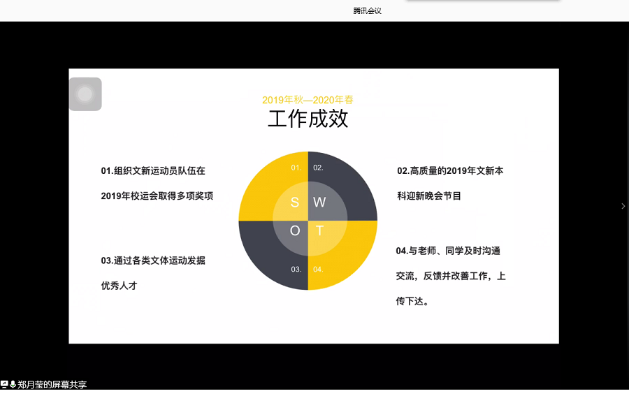 下午2时,会议准时开始。会议设主、分两会场。首先由学生会书记办公会在主会场依次述职,随后其他团委学生干部和学生会学生干部分别在两个分会场同时进行述职。每名学生干部作述职报告完毕,学生代表团即进行线上打分。会议中,各团学干部简要汇报个人素质、任职情况、学习情况、工作成效等方面表现,并对任职以来的工作学习经历进行了总结和反思,还就体球网手机比分