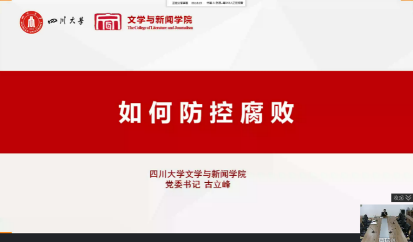 党委书记古立峰教授、院长李怡教授走进2019级本科生的《形势与政策》线上课堂,为同学们带来特殊的爱国廉政党课。2019级本科生辅导员贾瑞琪老师、兼职辅导员张佳奇在文科楼一区311会议室旁听。