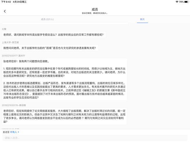 讲座结束前,同学们通过在线语音与文字留言的方式与张志强教授就新技术发展对出版行业的影响、出版史研究和出版专业就业等问题进行了互动交流,主持人王炎龙教授也与大家分享了讲座感受:“张志强教授的全面解读和深刻讲解,使我们对自身现在研究的专业和学科有了更深层次的认知和理解,也为我们指明了方向。张教授对这四个方面非常深入的解读,其视野是比较的和历史的,在展示过程中使用的数据和信息本身的内容都具有权威性。这次讲座使我对整个出版学的前世今生有了深刻体会,这一进程体现了出版的演化史其实就是文字史、文化史和文明史。出版的变迁体现了技术的进化、知识的传承和知识的创新,而出版人、出版家的奋斗史也彰显出我们对学问的探究精神。”