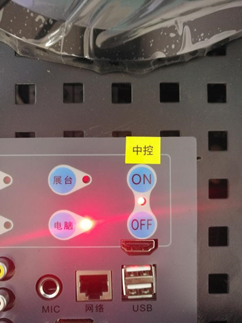 如需要使用笔记本电脑投屏使用,将此HDMI接口接入笔记本电脑,然后将中控操作台的笔记本标识按钮按下,让其旁边的红灯亮起即可正常使用。